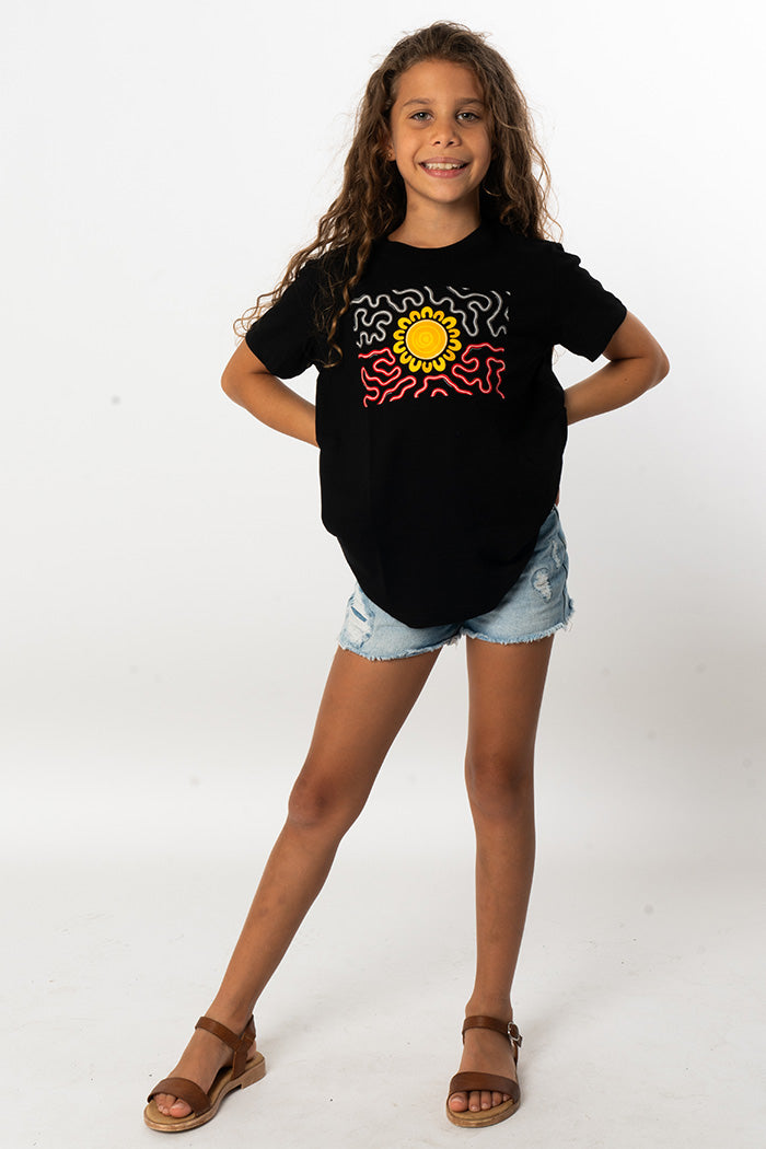 "A minimalist and groovy linework design representing our connection through the cultural threads that hold us together. Featuring a bright bold sun that doubles as a meeting place, showcasing our connection to one another and to Country." - Caitlin