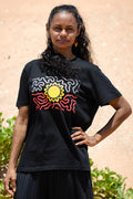 "A minimalist and groovy linework design representing our connection through the cultural threads that hold us together. Featuring a bright bold sun that doubles as a meeting place, showcasing our connection to one another and to Country." - Caitlin