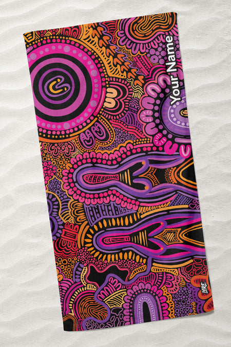 Make your next beach trip an amazing experience with the beautiful beach towels from Lore, featuring artwork from Alkina Edwards. We have a beautiful range of sublimated designs to choose from and each artwork tells the story of the artist's deep connection to Country.