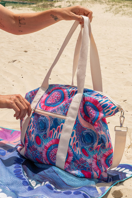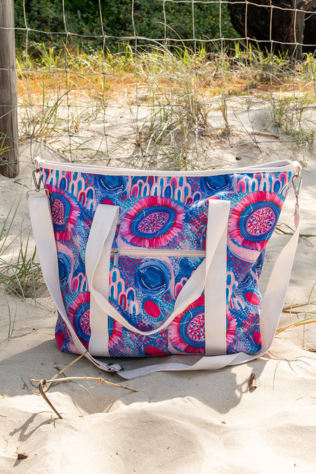 Made with a silky lining and a secure zip closure, the bag offers long, comfortable handles and generous space for all your essentials – from towels and hats to sunscreen and snacks. Lightweight yet durable, it’s built to last season after season while. Blending practical design and authentic First Nations artwork, this bag is as functional as it is meaningful. Looking for more summer style? Pair it with matching ponchos and sand-free towels from our new Beach Range.