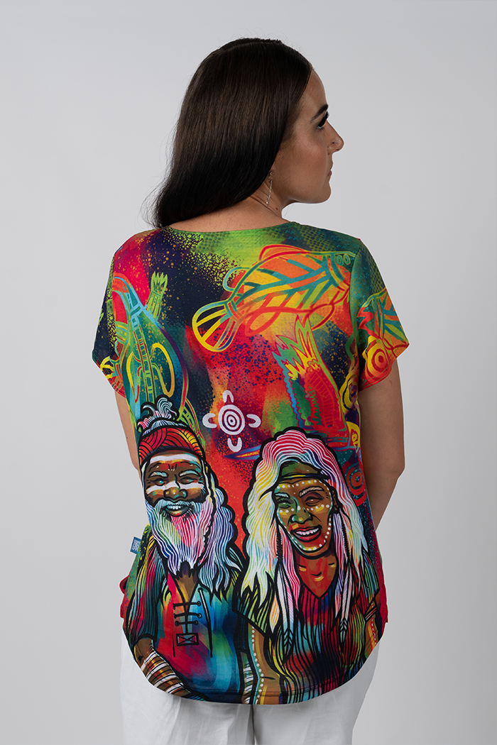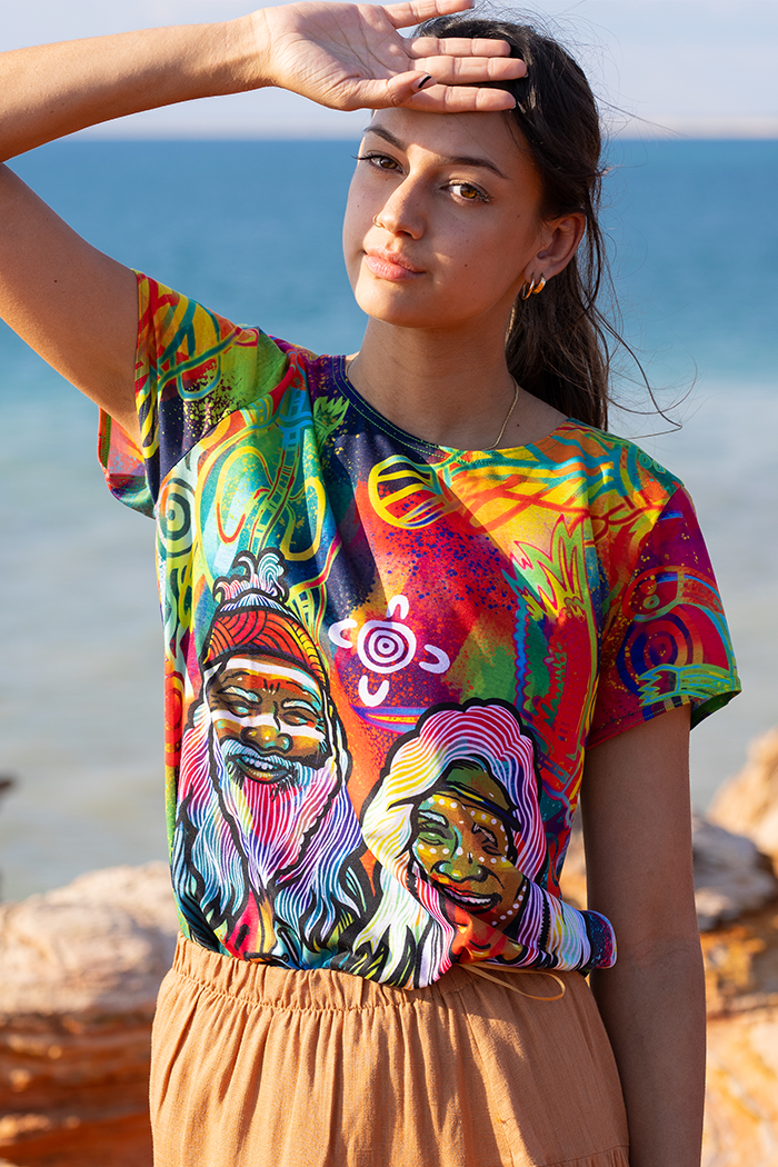 These vibrant fashion feature artwork that represents the theme “For Our Elders”, an acknowledgment of the pivotal roles that Elders have and continue to play in their communities and a celebration of everything they have achieved. This item was originally released as part of our iconic NAIDOC 2023 collection.