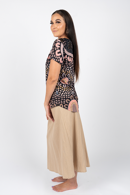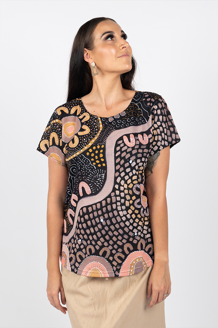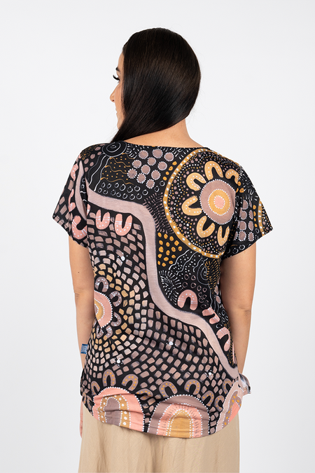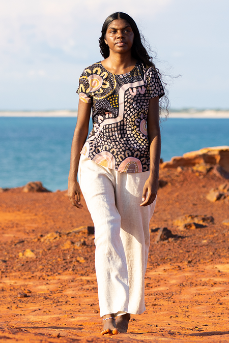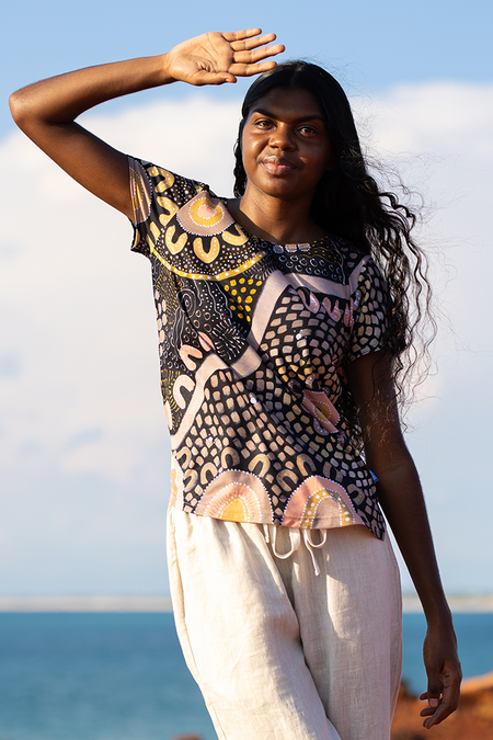 These vibrant fashion feature artwork that represents the theme “For Our Elders”, an acknowledgment of the pivotal roles that Elders have and continue to play in their communities and a celebration of everything they have achieved. This item was originally released as part of our iconic NAIDOC 2023 collection.
