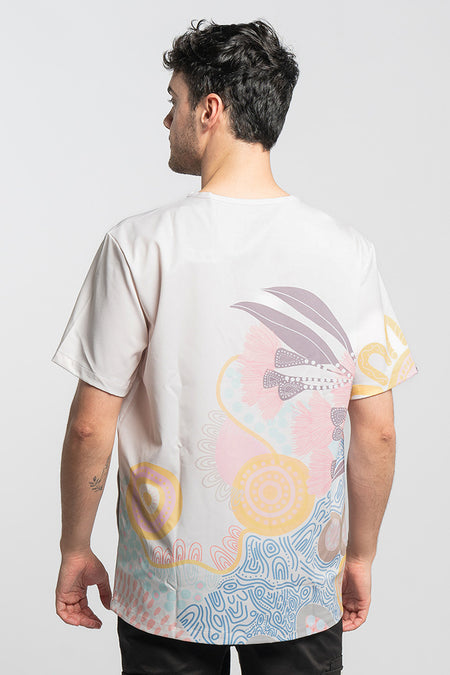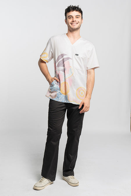 Brighten up long days on your feet caring for those who need it most! Our scrubs feature First Nations artwork printed onto high tech, high quality workwear that is both practical and beautiful. Our new Essence style highlights key features of the artwork against a subtle background.