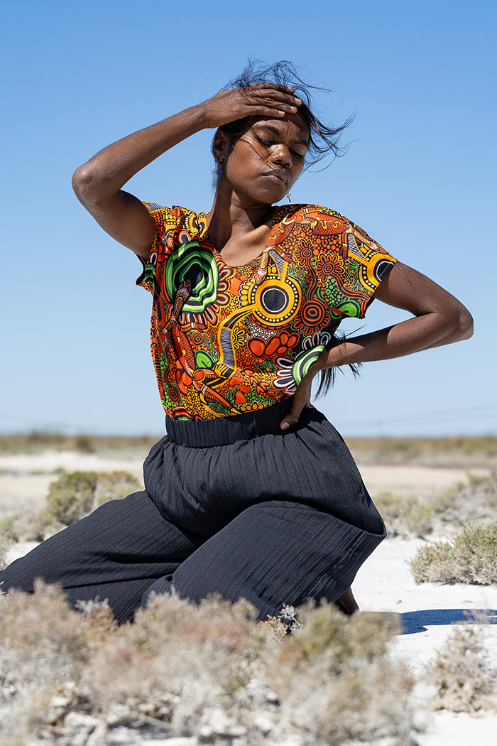 We collaborate with a large community of First Nations artists from across Australia, each bringing their own unique and authentic artistic style. The foundation of partnerships is respect, empowerment, and celebration, with royalties paid to artists on every purchase – supporting long-term career growth and creativity. Discover and learn about artists here.