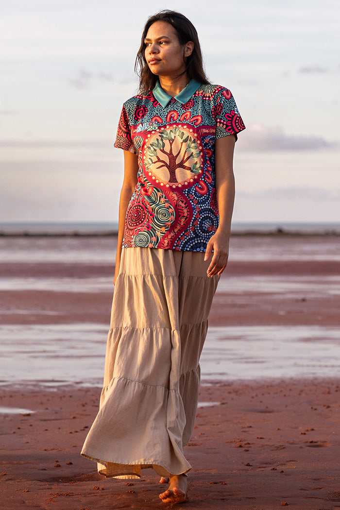 With built-in UPF50+ sun protection, you can enjoy the outdoors with confidence, knowing your skin is shielded from harsh UV rays. Available in unisex, fitted, and kids’ sizes, this polo is more than just everyday wear—it’s a vibrant celebration of First Nations culture, designed to be seen and appreciated wherever you go.