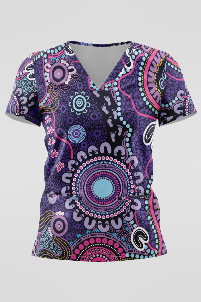 Brighten your workday with scrubs that blend cultural significance with high-performance workwear. Featuring First Nations artwork on a tailored yet breathable design, this scrub top is as practical as it is beautiful.