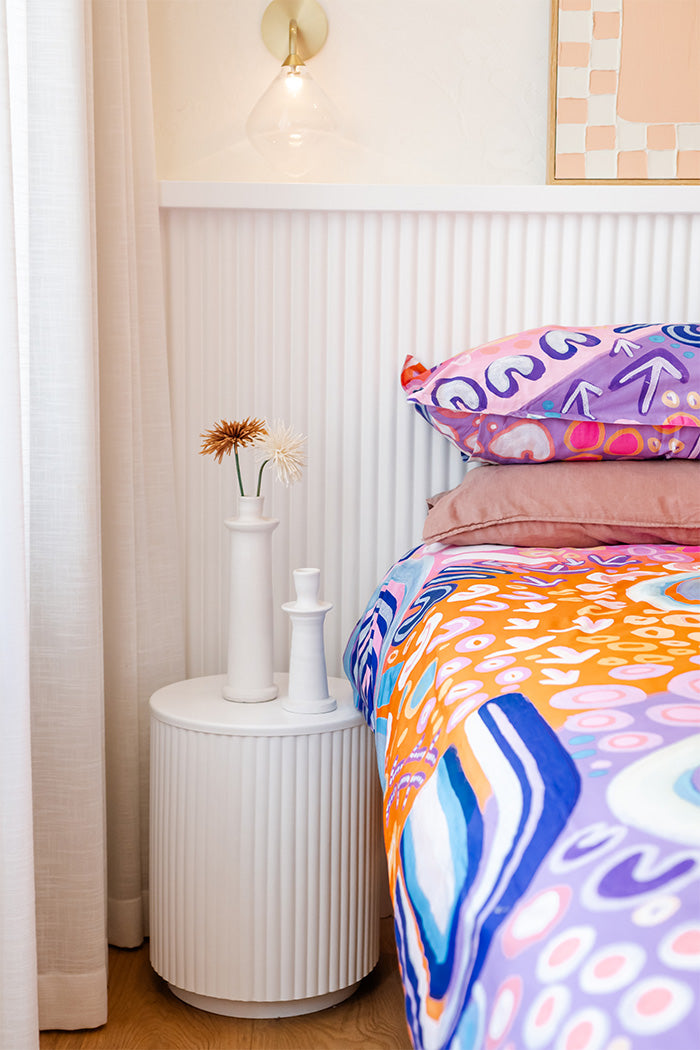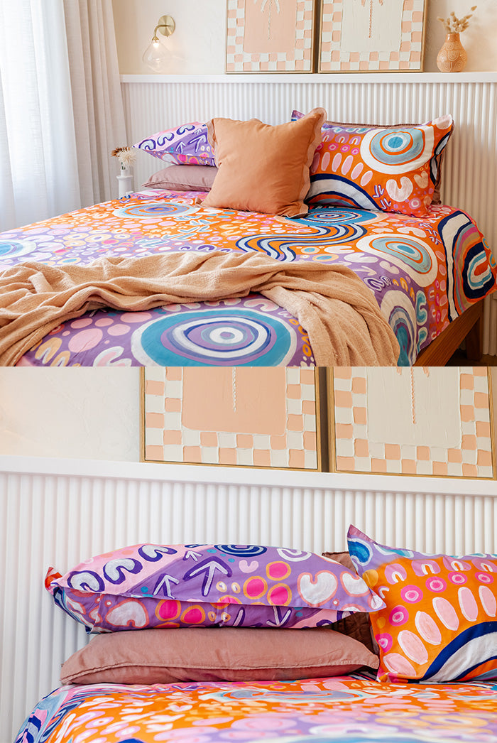 Drift into a world of elegance and artistry with our premium quilt cover sets, where breath taking landscapes meet exceptional craftsmanship. Designed by First Nations artists from across Australia, each piece captures the beauty of nature in soft, shimmering hues, transforming your bedroom into a serene retreat.