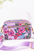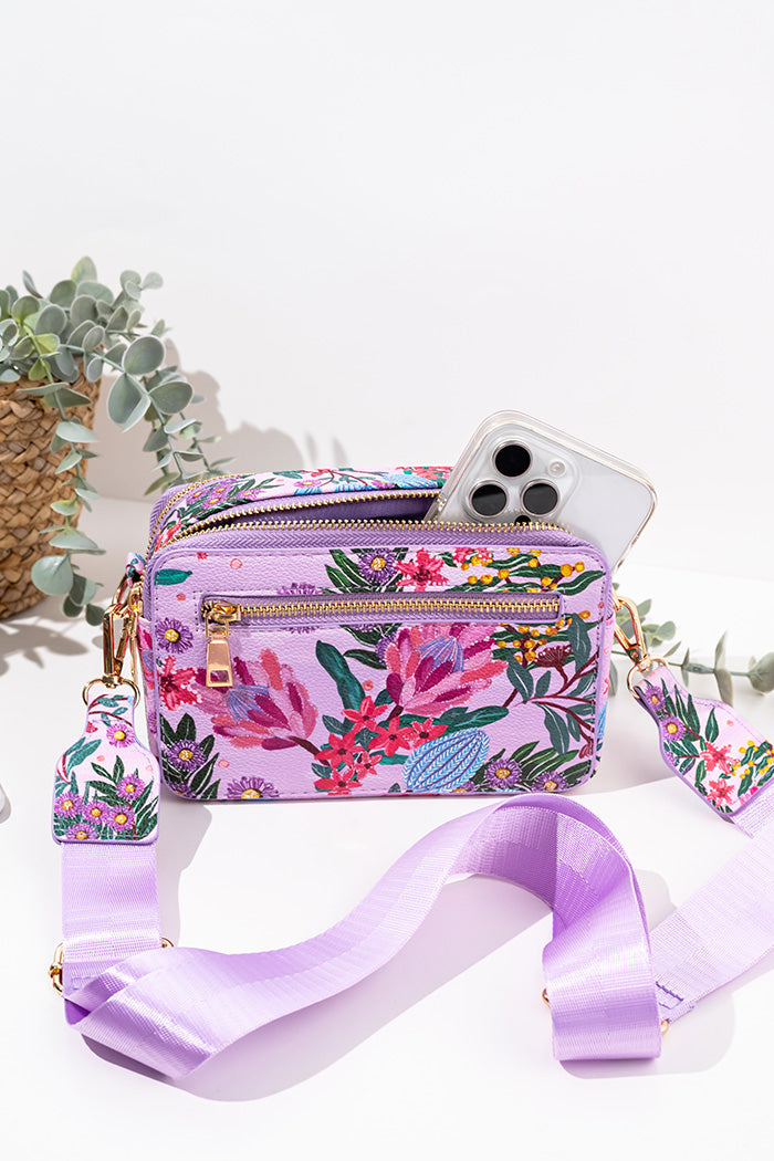 Fabric: Digitally printed PU exterior. PU interior and 70% Cotton 30% Polyester lining. Polyester strap. Gold metal zip closures.