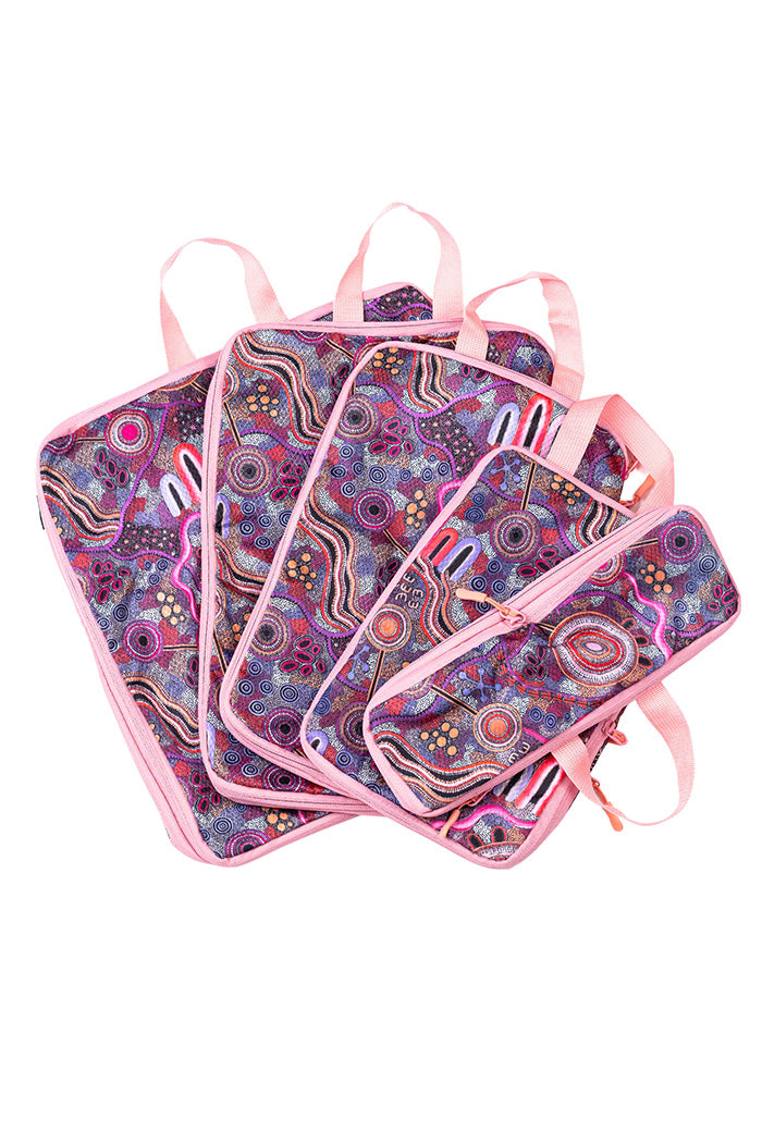 Travels ahead? Stay organised in style on your next adventure with our 5 pack of packing cubes featuring vibrant First Nations designs.