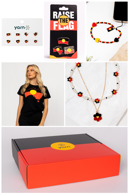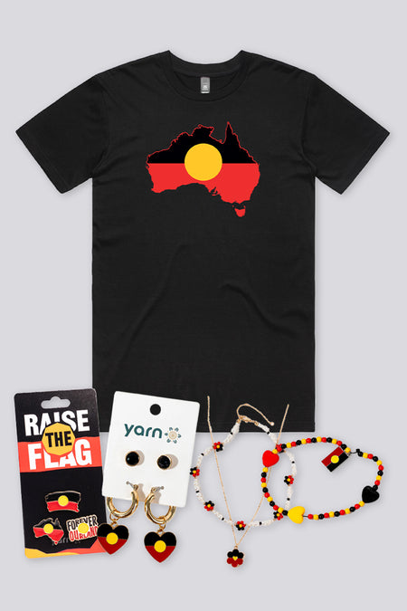 This bundle is from our ‘Raise the Flag’ collection: a range that celebrates the Aboriginal flag being placed into public hands. Add some beautiful colour and vibrancy to your wardrobe and make a supportive statement.