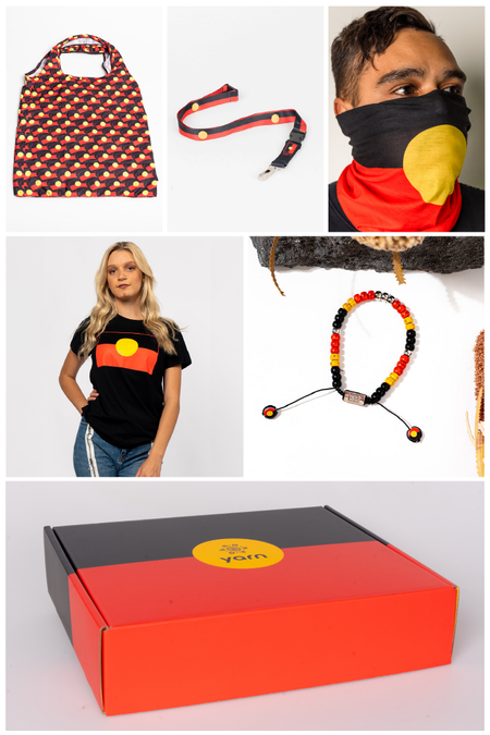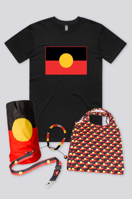 This bundle is from our ‘Raise the Flag’ collection: a range that celebrates the Aboriginal flag being placed into public hands. Add some beautiful colour and vibrancy to your wardrobe and make a supportive statement.