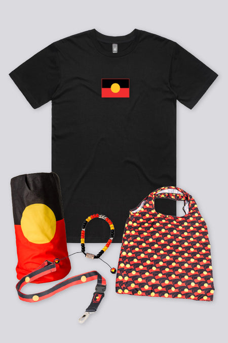 This bundle is from our ‘Raise the Flag’ collection: a range that celebrates the Aboriginal flag being placed into public hands. Add some beautiful colour and vibrancy to your wardrobe and make a supportive statement.