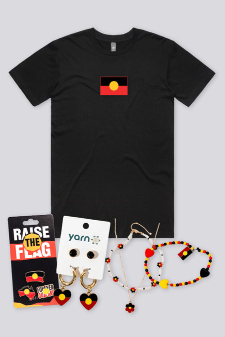This bundle is from our ‘Raise the Flag’ collection: a range that celebrates the Aboriginal flag being placed into public hands. Add some beautiful colour and vibrancy to your wardrobe and make a supportive statement.