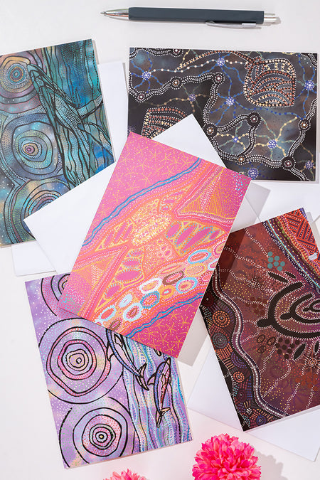 There are 5 cards in each pack with unique artworks that celebrate Country and culture. Each card is blank inside so you can write your messages however you want to and comes with a plain white envelope ready to send to your loved ones.