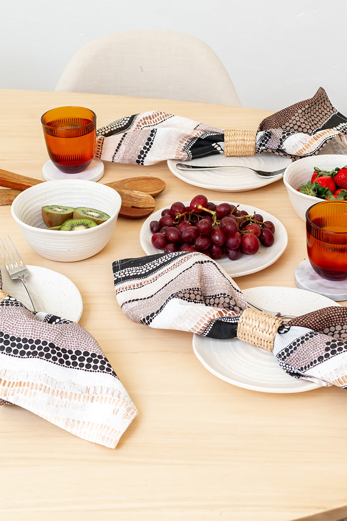 Printed locally in our studio in Meanjin (Brisbane) on natural flax linen, this elegant collection of fine homewares features muted colours on an earthy palette. Perfect for dinner parties, gifts, and adding a touch of natural sophistication around the home and table.
