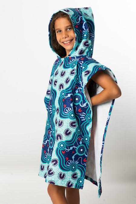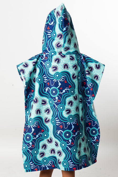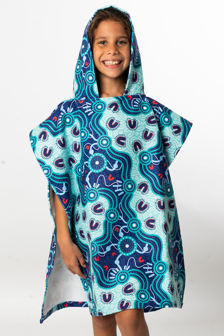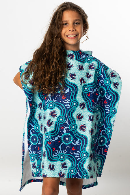Featuring bright and bubbly First Nations artwork by Kamilaroi artist Teagan Malcolm, this hooded beach towel is the perfect companion for beach days, poolside fun, and water adventures. Designed for both comfort and practicality, it has a soft cotton backing that is gentle on the skin, while the smooth polyester front showcases vibrant artwork that stays bold wash after wash.