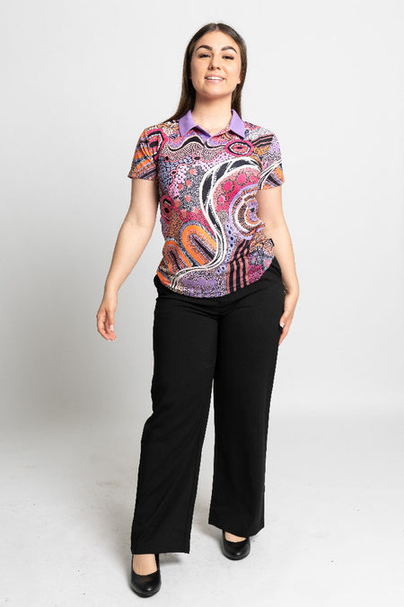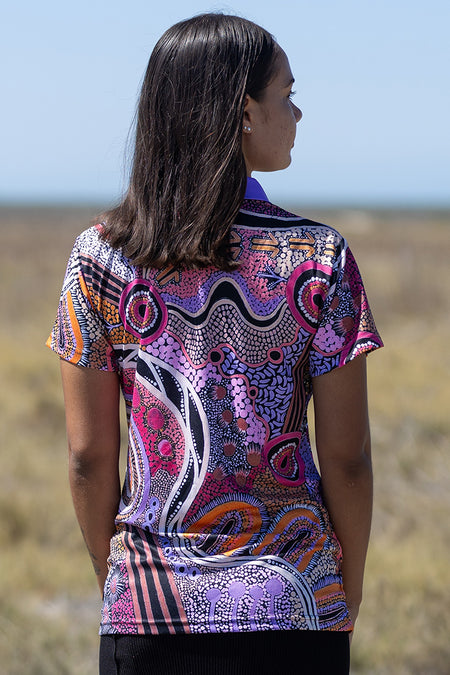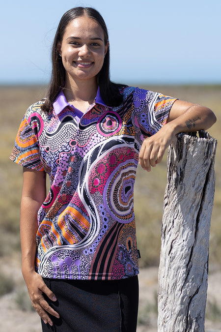Jessica's art is inspired by family, Country, and Culture in the Yued region in Western Australia. In her debut polo and fashion range she celebrates and honours her heritage through vibrant pieces that each tell a distinct yet connected story.