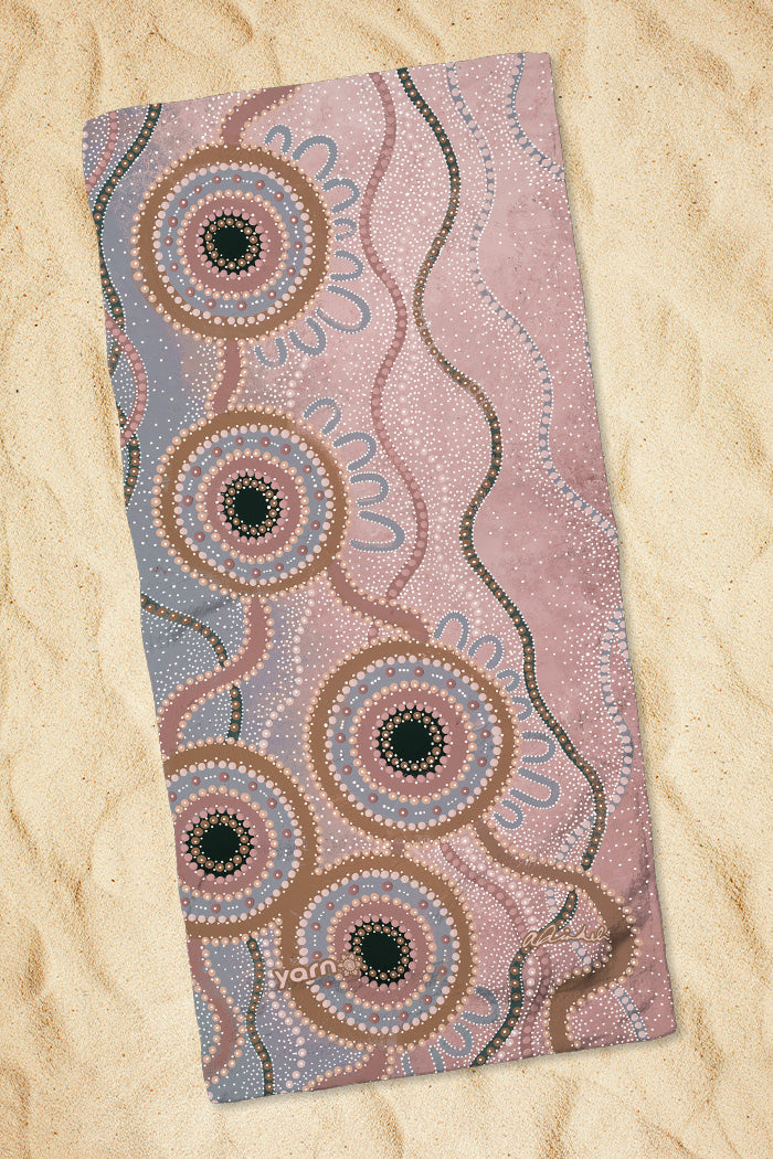 Get ready to kick back and relax at the beach or pool with this beautiful towel. Made from soft and absorbent fabric with a cotton backing, this towel is perfect for drying off after a swim or lounging in the sun. Each towel features a beautiful, sublimated design that tells a unique story of the artist's deep connection to Country.