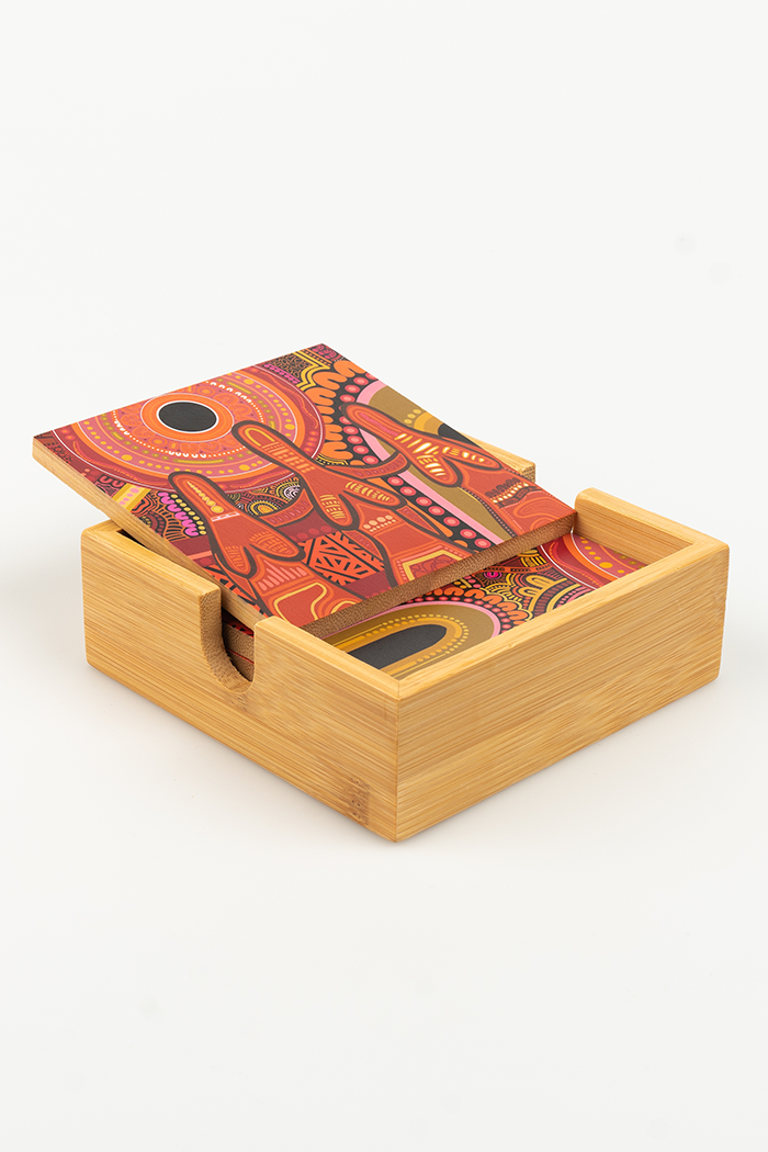 Brighten up your coffee table with these beautiful bamboo coasters from Lore, featuring gorgeous artwork from Alkina Edwards. The bright and vibrant colours of the artwork showcase the artist's deep connection to Country.