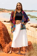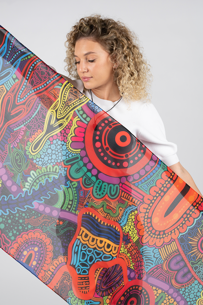 Featuring vibrant artwork from Alkina Edwards, these scarves drape beautifully and add colour to your outfit without heaviness or bulk.